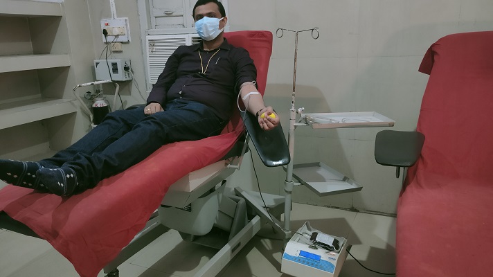 Dr Mrinalkumar Ramshankar Sharma from WHO Country Office for India donates blood at Krishnadevi Deviprasad Kejriwal Maternity Hospital Blood Bank in Muzaffarpur, Bihar, on 10 February 2022. Year-round voluntary blood donations are needed to provide sustainable and safe transfusion services to everyone who needs it. (Photo: Nalinikant Ojha/ © WHO India)