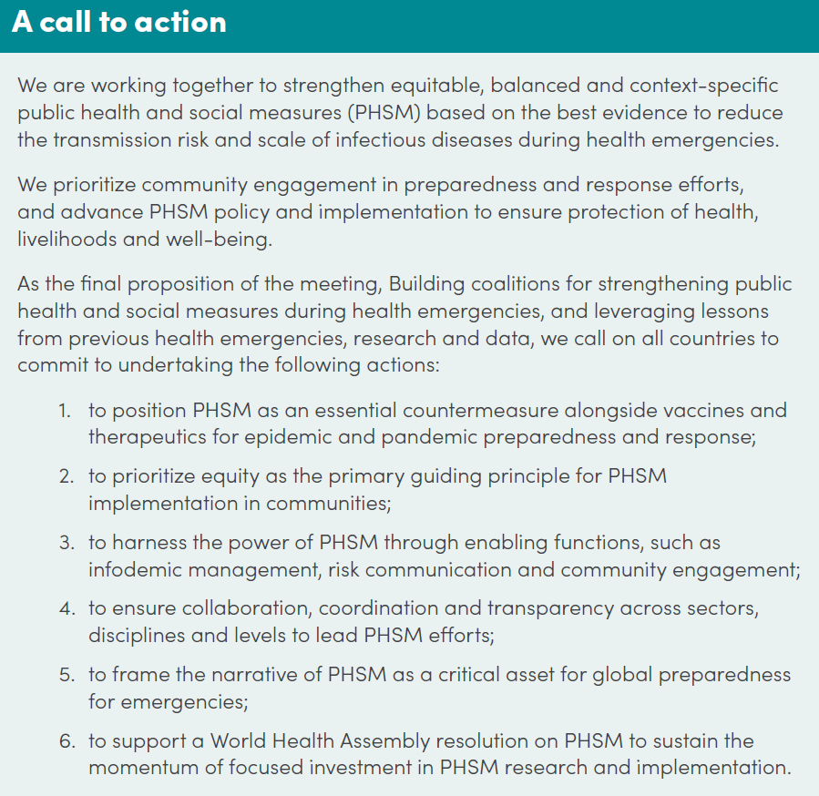 Leveraging country experiences and lessons learned from previous health emergencies, global health experts put forth a call to action for PHSM during the WHO meeting, Building coalitions for strengthening public health and social measures during health emergencies, during 14 - 15 June 2023.