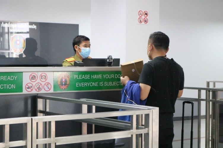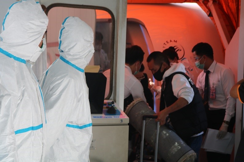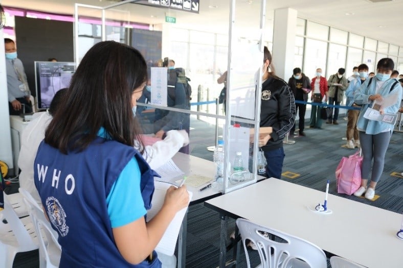 The health staff checked the completeness of documents from the passengers, including COVID-19 test results taken before departure and the health declaration form. Photo credit: WHO/Irene Tan