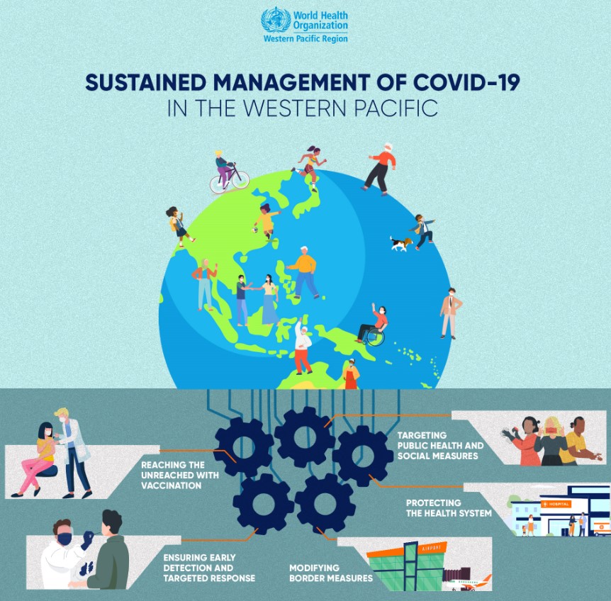 The sustained management approach for COVID-19 in the Western Pacific Region includes five key elements: vaccination, public health and social measures appropriately calibrated for the local context, protecting the health system, early detection and targeted response, and international border measures (again, appropriately calibrated for the context). These should be supported by strong surveillance, contact tracing and monitoring, and clear communication.