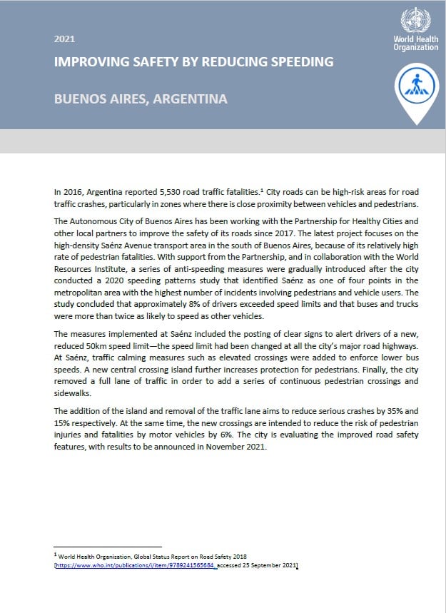 The Autonomous City of Buenos Aires has been working with the Partnership for Healthy Cities and other local partners to improve the safety of its roads since 2017. The latest project focuses on the high-density Saénz Avenue transport area in the south of Buenos Aires, because of its relatively high rate of pedestrian fatalities. With support from the Partnership, and in collaboration with the World Resources Institute, a series of anti-speeding measures were gradually introduced after the city conducted a 2020 speeding patterns study that identified Saénz as one of four points in the metropolitan area with the highest number of incidents involving pedestrians and vehicle users. The study concluded that approximately 8% of drivers exceeded speed limits and that buses and trucks were more than twice as likely to speed as other vehicles.